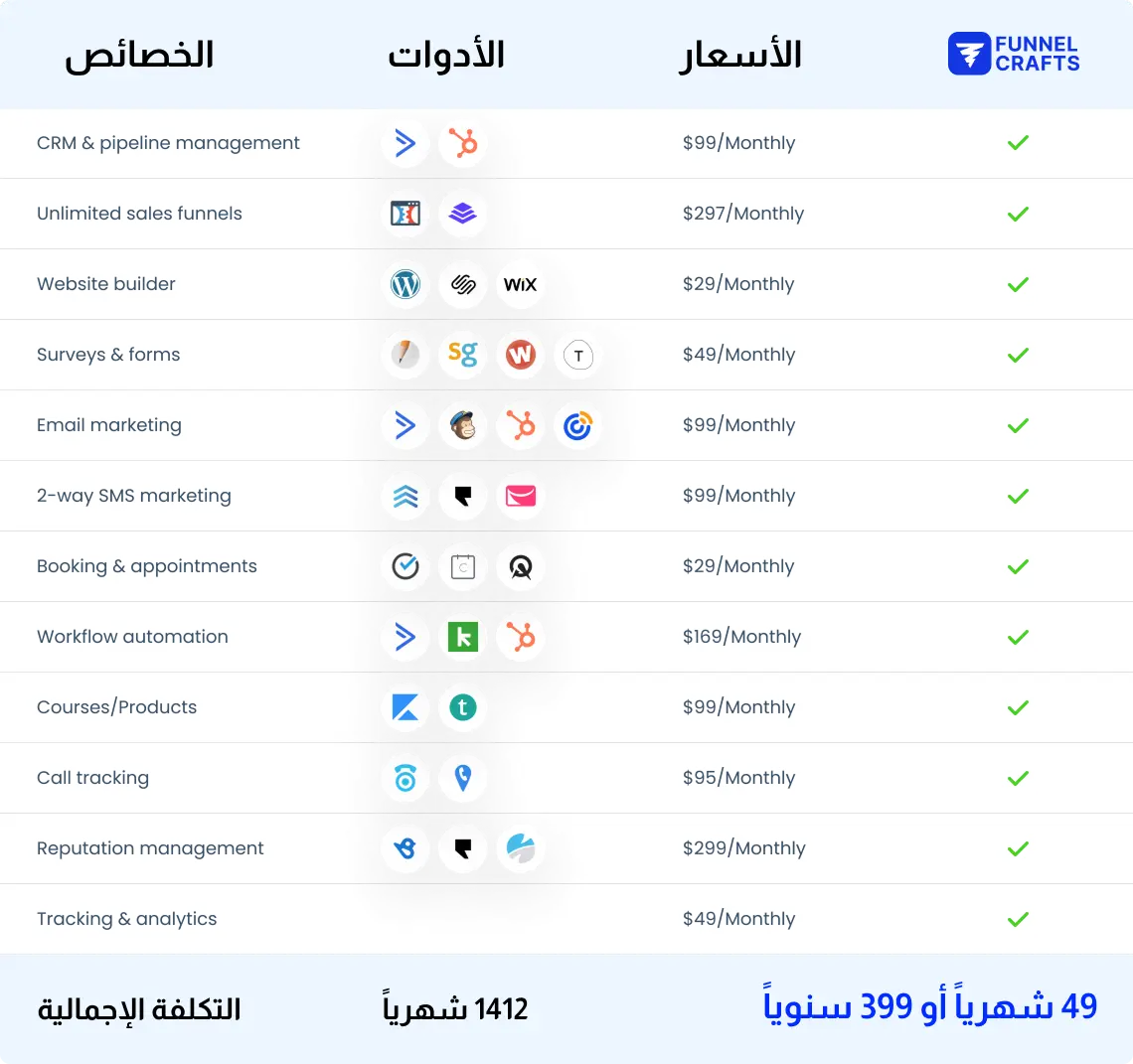 Funnel Crafts تكلف 49 دولار شهرياً أو 399 دولار سنوياً. نعم، يمكنك إلغاء اشتراكك في أي وقت.اذا كان هناك عروض فتكون لأول عام عند اشتراكك .